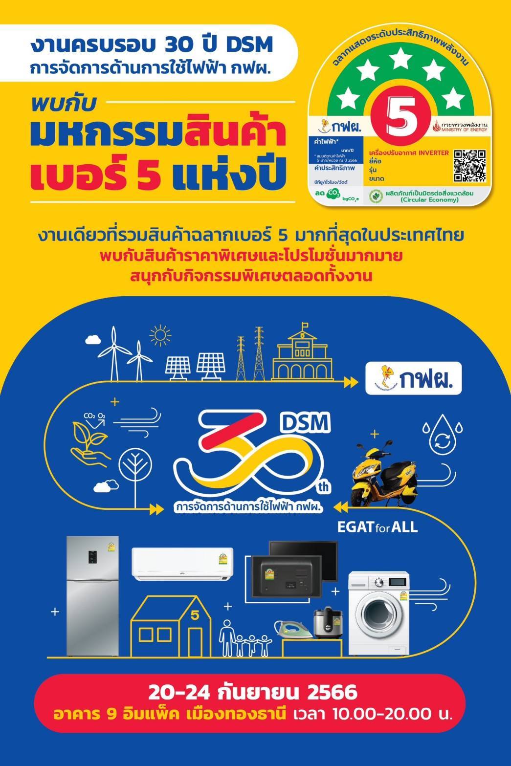 จึงเตรียมเปิดตัวฉลากประหยัดไฟฟ้าเบอร์ 5 รูปแบบใหม่ ซึ่งจะเริ่มใช้งานตั้งแต่วันที่ 1 มกราคม 2567 เป็นต้นไป และเปิดตัวโครงการโรงเรียนเบอร์ 5 เป็นครั้งแรกในงานมหกรรม 30 ปี DSM ซึ่งจะจัดขึ้นวันที่ 20 - 24 กันยายน 2566 ณ Hall 9 อิมแพ็ค เมืองทองธานี เพื่อยกระดับการจัดการใช้พลังงานของภาคประชาชนและลดการปล่อยก๊าซคาร์บอนไดออกไซด์อย่างเป็นรูปธรรมมากขึ้น พร้อมร่วมชมบ้านเบอร์ 5 จำลองที่รวบรวมนวัตกรรมพลังงานแห่งอนาคต นิทรรศการผลสำเร็จ 30 ปี DSM ผลงานและนวัตกรรมจากโรงเรียนในโครงการห้องเรียนสีเขียว