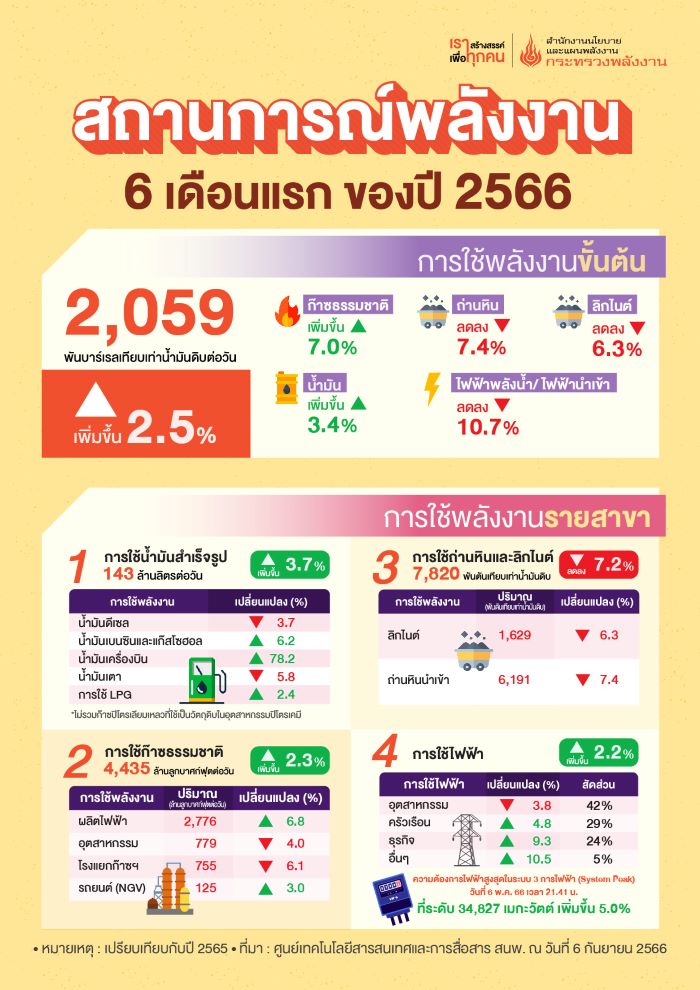นายวัฒนพงษ์ คุโรวาท ผู้อำนวยการสำนักงานนโยบายและแผนพลังงาน (สนพ.) เปิดเผยถึงสถานการณ์พลังงานครึ่งปีแรกของปี 2566 พบว่า ภาพรวมการใช้พลังงานขั้นต้นมีปริมาณการใช้ อยู่ที่ระดับ 2,059 พันบาร์เรลเทียบเท่าน้ำมันดิบต่อวัน เพิ่มขึ้นร้อยละ 2.5 เทียบกับช่วงเดียว กันของปีก่อน จากสภาวะเศรษฐกิจภายในประเทศที่ปรับตัวดีขึ้น โดยเพิ่มขึ้นในส่วนของการใช้น้ำมันและก๊าซธรรมชาติ ทั้งนี้การใช้น้ำมันเพิ่มขึ้นร้อยละ 3.4 และการใช้ก๊าซธรรมชาติปรับตัวเพิ่มขึ้นมากถึงร้อยละ 7.0 จากการใช้ก๊าซธรรมชาติเป็นเชื้อเพลิงสำหรับรถยนต์และใช้เป็นเชื้อเพลิงในการผลิตไฟฟ้าเพิ่มขึ้น สอดคล้องกับความต้องการไฟฟ้าในสาขาท่องเที่ยวและบริการที่เพิ่มขึ้นหลังเกิดการฟื้นตัวทางเศรษฐกิจ ในขณะที่การใช้ไฟฟ้าพลังน้ำ/ไฟฟ้านำเข้า ลดลงร้อยละ 10.7 จากปริมาณการนำเข้าไฟฟ้าพลังน้ำที่ลดลงเนื่องจากปัญหาภัยแล้ง ทำให้น้ำเหนือเขื่อนของ สปป. ลาว มีปริมาณลดลง สำหรับการใช้ถ่านหิน/ลิกไนต์ปรับตัวลดลงจากการใช้ที่ลดลงทั้งในภาคการผลิตไฟฟ้าและภาคอุตสาหกรรม โดยการใช้ถ่าน หินลดลงร้อยละ 7.4 และการใช้ลิกไนต์ลดลงร้อยละ 6.3 ซึ่งสถานการณ์พลังงานรายเชื้อเพลิงในช่วง 6 เดือนแรกของปี 2566 สรุปได้ดังนี้