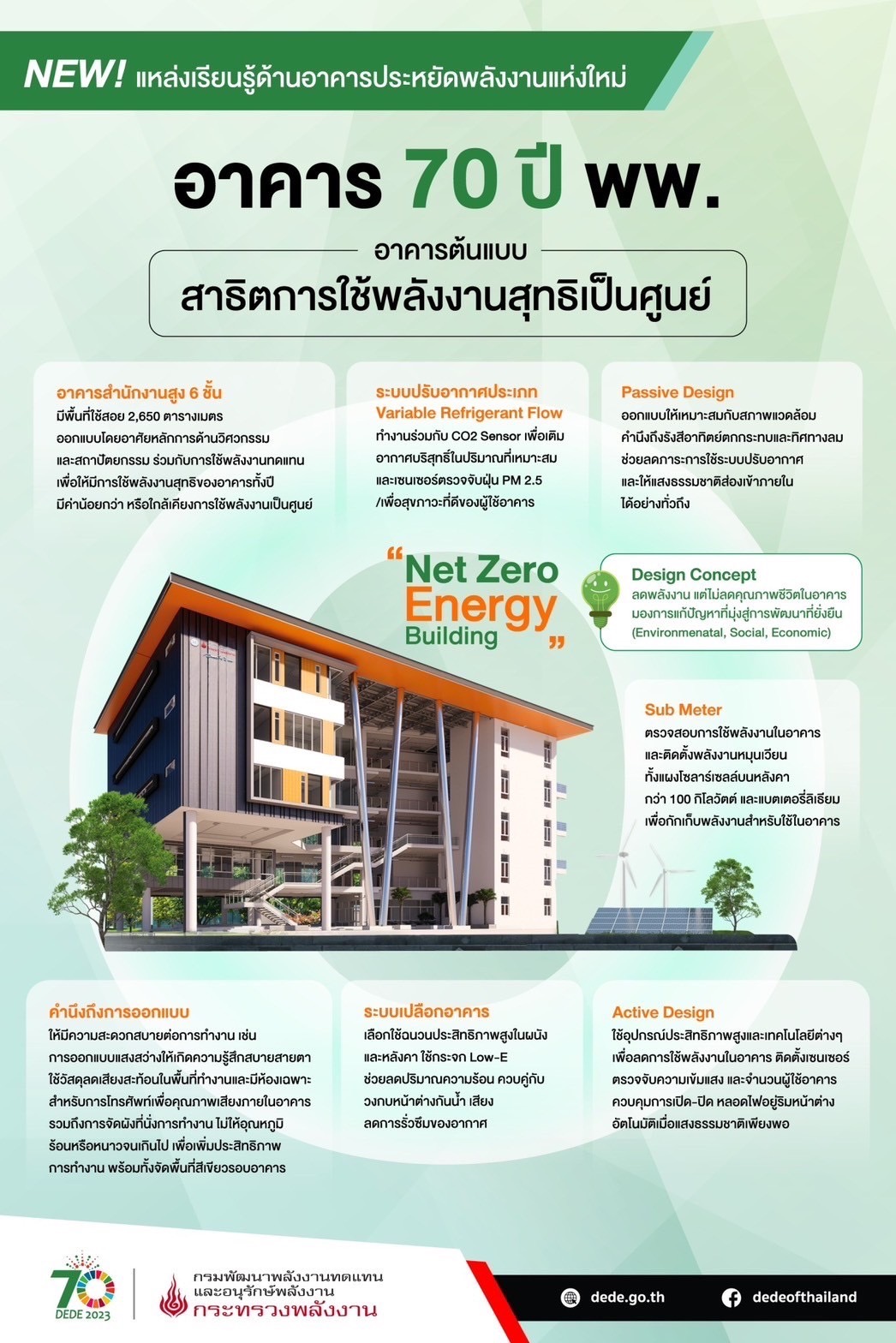 ด้าน นายโสภณ มณีโชติ รองอธิบดี รักษาราชการแทนอธิบดีกรมพัฒนาพลังงานทดแทนและอนุรักษ์พลังงาน (พพ.) กล่าวว่า เนื่องจาก พพ. มีอาคารสำนักงานที่ใช้งานมานานมากกว่า 50 ปี สภาพทรุดโทรม จึงมีความจำเป็นที่จะก่อสร้างอาคารสำนักงานประหยัดพลังงานดังกล่าวเพื่อทดแทนอาคารสำนักงานเดิม และใช้เป็นแหล่งเรียนรู้ศึกษาดูงานแก่หน่วยงานอื่นๆ รวมทั้งภาคประชาชน เพื่อให้เกิดความตระหนักและใส่ใจประหยัดพลังงานต่อไป สอดคล้องกับภารกิจตามแผนปฏิรูปประเทศด้านพลังงาน และแผนอนุรักษ์พลังงาน พ.ศ.2561 – 2580 (Energy Efficiency Plan : EEP2018) ทั้งนี้ อาคาร 70 ปี พพ. แห่งนี้ เป็นอาคารสำนักงานสูง 6 ชั้น มีพื้นที่ใช้สอย 2,650 ตารางเมตร โดยมีการออกแบบ ตามแนวคิด “ลดพลังงาน เสริมคุณภาพชีวิต” ซึ่งมีแนวคิดการออกแบบที่สำคัญ ได้แก่ “Passive Design” ซึ่งเป็นการออกแบบให้เหมาะสมกับสภาพแวดล้อม และ “Active Design” ที่มีการออกแบบโครงสร้างอาคารให้มีความยั่งยืนด้านการใช้พลังงาน ผ่านการพัฒนาเทคโนโลยี หรืออุปกรณ์ทันสมัยเข้ามาช่วยควบคุมการใช้พลังงาน เช่น การใช้ระบบปรับอากาศประสิทธภาพสูงทำงานร่วมกับเซ็นเซอร์ต่างๆ หรือการนำระบบบริหารจัดการอาคารอัตโนมัติมาประยุกต์ใช้ ซึ่งจะเป็นจุดเริ่มต้นที่ภาครัฐและภาคเอกชน สามารถนำมาเป็นแบบอย่างและต่อยอดเพื่อให้ Net Zero Energy Building เกิดขึ้นอย่างแพร่หลายในประเทศไทย