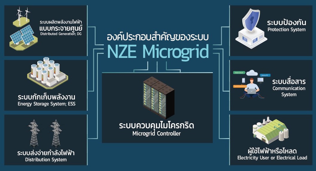 สนพ. จึงให้ความสำคัญกับการบริหารจัดการพลังงานรูปแบบใหม่ภายใต้แนวคิดของโครงข่ายไฟฟ้าขนาดเล็กแบบมีการใช้พลังงานสุทธิเป็นศูนย์ในพื้นที่ส่วนราชการ จึงได้นำร่องศึกษาระบบ NZE Microgrid เพื่อให้เกิดการใช้งานในประเทศ โดยได้คัดเลือกพร้อมทั้งลงพื้นที่สำรวจหน่วยงานราชการที่มีศักยภาพและมีความพร้อม จำนวน 29 แห่ง เพื่อวิเคราะห์ความเป็นไปได้ ความเหมาะสม และความคุ้มค่าของการใช้งานระบบ NZE Microgrid และพบว่าอาคารของหน่วยราชการแต่ละแห่งมีความแตกต่างกันทั้งในเชิงกายภาพและพฤติกรรมการใช้ไฟฟ้า ได้แก่ อายุของอาคาร ตำแหน่งที่ตั้ง พื้นที่และรูปทรงหลังคา รูปแบบ ปริมาณการใช้ไฟฟ้า เป็นต้น ซึ่งส่งผลโดยตรงต่อการออกแบบระบบ NZE Microgrid นอกจากนี้อาคารบางแห่งยังจำเป็นต้องมีการกักเก็บไฟฟ้าสำรองไว้เพื่อรองรับโหลดวิกฤต (Critical Load) ตลอดเวลา ดังนั้น จึงต้องมีการออกแบบและจัดเตรียมระบบกักเก็บพลังงาน (ESS) ให้มีความสอดคล้องกับปริมาณดังกล่าวควบคู่กันไปด้วย