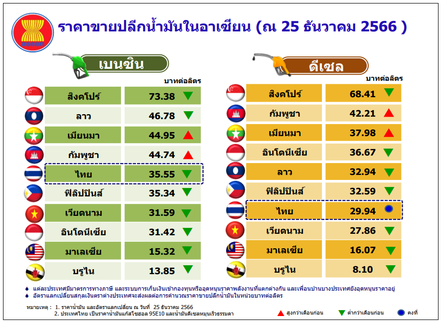 สำหรับราคาขายปลีกน้ำมันเบนซินและดีเซลของประเทศไทยและต่างประเทศ ณ วันที่ 25 ธันวาคม 2566 พบว่า ราคาขายปลีกน้ำมันเบนซิน ประเทศสิงคโปร์มีระดับสูงสุดในกลุ่มอาเซียน อยู่ที่ระดับ 73.38 บาทต่อลิตร ขณะที่ประเทศไทยอยู่ในอันดับ 5 ของกลุ่มอาเซียน อยู่ที่ระดับ 35.55 บาทต่อลิตร ส่วนราคาขายปลีกน้ำมันดีเซลนั้น ประเทศสิงคโปร์ มีระดับสูงสุดในกลุ่มอาเซียน อยู่ที่ระดับ 68.41 บาทต่อลิตร ขณะที่ประเทศไทยอยู่ในอันดับ 7 ของกลุ่มอาเซียน อยู่ที่ระดับ 29.94 บาทต่อลิตร