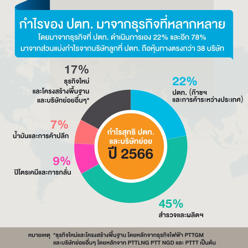 ซึ่งมีผลการดำเนินงานจากธุรกิจพลังงานแห่งอนาคตและธุรกิจใหม่เพิ่มขึ้น จากบริษัท Avaada Energy Private Limited (Avaada) ที่มีการลงทุนในโครงการโรงไฟฟ้าพลังงานแสงอาทิตย์ในประเทศอินเดีย และจากบริษัท Lotus Pharmaceutical Company Limited (Lotus) ที่ดำเนินธุรกิจผลิตและจำหน่ายยาสามัญ ในประเทศไต้หวัน และกลุ่มธุรกิจน้ำมันและค้าปลีก 7% ซึ่งประกอบด้วยธุรกิจน้ำมันและธุรกิจ Non-Oil เช่น กาแฟ และร้านสะดวกซื้อ ที่มีกำไรต่อรายได้แค่เพียง 1% ขณะที่เป็นกำไรจากการดำเนินธุรกิจก๊าซธรรมชาติ และธุรกิจการค้าระหว่างประเทศของ ปตท. เพียง 22%