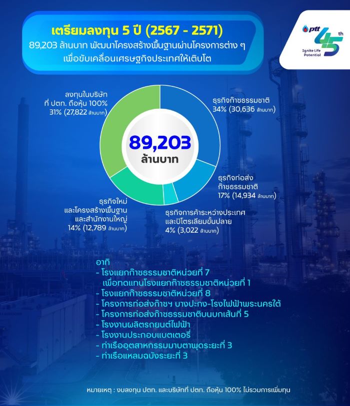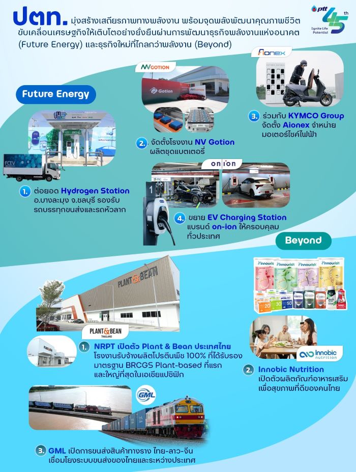 ด้านธุรกิจใหม่ที่ไกลกว่าพลังงาน NRPT เปิดตัว Plant & Bean ประเทศไทย โรงงานรับจ้างผลิตโปรตีนพืช 100% ที่ได้รับมาตรฐานความปลอดภัยทางอาหารระดับโลก BRCGS Plant-based ที่แรก และใหญ่ที่สุดในภูมิภาคเอเชียแปซิฟิก Innobic Nutrition เปิดตัวผลิตภัณฑ์อาหารเสริมเพื่อสุขภาพที่ดีของคนไทย สำหรับในด้านธุรกิจโลจิสติกส์ เปิดการขนส่งสินค้าทางรางเส้นทาง ไทย-ลาว-จีน เชื่อมโยงระบบขนส่งไทยและภูมิภาคอาเซียน และเตรียมงบลงทุน ประจำปี 2567 – 2571 จำนวน 89,203 ล้านบาท มุ่งผลักดันเศรษฐกิจประเทศให้เดินหน้า