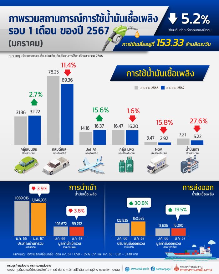 นายสราวุธ แก้วตาทิพย์ อธิบดีกรมธุรกิจพลังงาน เผยภาพรวมการใช้น้ำมันเชื้อเพลิงเฉลี่ย เดือนมกราคม 2567 อยู่ที่ 153.33 ล้านลิตร/วัน ลดลงเมื่อเทียบกับช่วงเดียวกันของปีก่อน ร้อยละ 5.2 โดยการใช้น้ำมันกลุ่มเบนซินเพิ่มขึ้นร้อยละ 2.7 น้ำมันอากาศยานเชิงพาณิชย์ (Jet A1) เพิ่มขึ้นร้อยละ 15.6 ขณะที่น้ำมันเตา NGV น้ำมันกลุ่มดีเซล และ LPG มีการใช้ลดลงร้อยละ 27.6 ร้อยละ 15.8 ร้อยละ 11.4 และร้อยละ 1.6 ตามลำดับ นอกจากนี้ กรมธุรกิจพลังงานได้มีการประกาศใช้น้ำมันมาตรฐานยูโร 5 ตั้งแต่ 1 มกราคม 2567 เป็นต้นไป เพื่อลดฝุ่น PM 2.5 ซึ่งเป็นผลสืบเนื่องมาจากปัญหามลพิษทางอากาศและฝุ่นละอองขนาดเล็กที่มีผลกระทบต่อสุขภาพของประชาชนในวงกว้าง