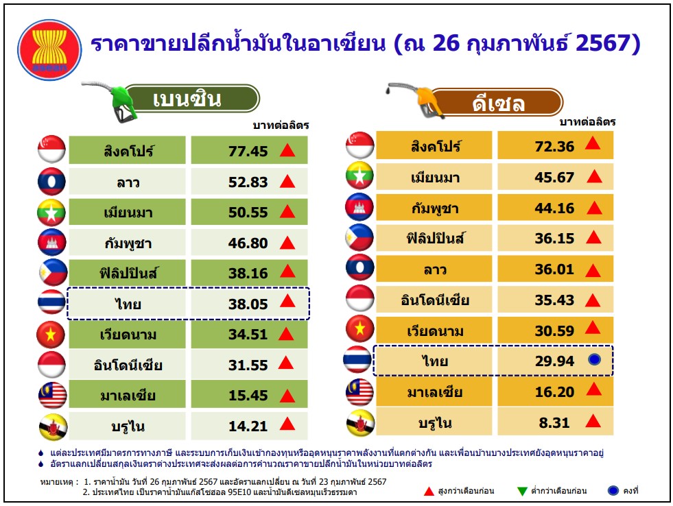 สำหรับราคาขายปลีกน้ำมันเบนซินและดีเซลของประเทศไทยและต่างประเทศ ณ วันที่26 กุมภาพันธ์2567 พบว่า ราคาขายปลีกน้ำมันเบนซิน ประเทศสิงคโปร์มีระดับสูงสุดในกลุ่มอาเซียน อยู่ที่ระดับ 77.45 บาทต่อลิตร ขณะที่ประเทศไทยอยู่ในอันดับ 6 ของกลุ่มอาเซียน อยู่ที่ระดับ 38.05 บาทต่อลิตร ส่วนราคาขายปลีกน้ำมันดีเซลนั้น ประเทศสิงคโปร์ มีระดับสูงสุดในกลุ่มอาเซียน อยู่ที่ระดับ 72.36 บาทต่อลิตร ขณะที่ประเทศไทยอยู่ในอันดับ 8 ของกลุ่มอาเซียน อยู่ที่ระดับ 29.94 บาทต่อลิตร อย่างไรก็ตาม ราคาขายปลีกน้ำมันสำเร็จรูปในแต่ละประเทศจะแตกต่างกัน ขึ้นอยู่กับโครงสร้าง มาตรการด้านภาษี และนโยบายการชดเชยราคาน้ำมันของประเทศนั้น