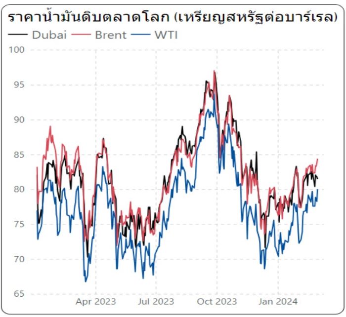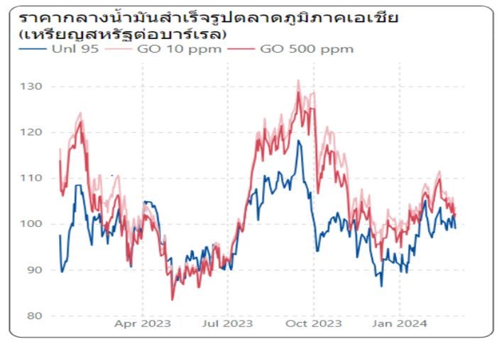 สนพ. ยังได้ติดตามสถานการณ์ราคาน้ำมันเชื้อเพลิงในตลาดโลก (ระหว่างวันที่ 26 กุมภาพันธ์ – 1 มีนาคม 2567) พบว่า ราคาน้ำมันดิบยังคงผันผวน โดยราคาน้ำมันดิบดูไบ เฉลี่ยอยู่ที่ระดับ 81.53 เหรียญสหรัฐต่อบาร์เรล ปรับตัวลดลงจากสัปดาห์ที่แล้ว 0.69 เหรียญสหรัฐต่อบาร์เรล ขณะที่น้ำมันดิบเวสต์ เท็กซัส ทรงตัวอยู่ที่ระดับ 78.64 เหรียญสหรัฐต่อบาร์เรล สำหรับสถานการณ์ราคากลางน้ำมันสำเร็จรูปตลาดภูมิภาคเอเชีย พบว่า ราคาน้ำมันเบนซินออกเทน 95 ทรงตัวอยู่ที่ระดับ 100.54 เหรียญสหรัฐต่อบาร์เรล ส่วนราคาน้ำมันดีเซลหมุนเร็ว (10 PPM) เฉลี่ยอยู่ที่ระดับ 104.01 เหรียญสหรัฐต่อบาร์เรล ปรับตัวลดลงจากสัปดาห์ที่แล้ว 1.91 เหรียญสหรัฐต่อบาร์เรล