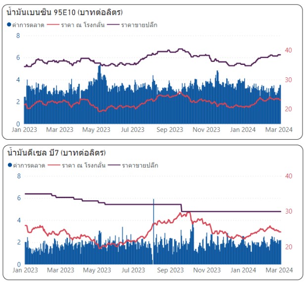 เนื่องจากค่าเงินบาทของไทยแข็งค่าขึ้นจากสัปดาห์ที่แล้ว 0.06 บาทต่อเหรียญสหรัฐฯ มาอยู่ที่ระดับเฉลี่ย 36.08 บาทต่อเหรียญสหรัฐฯ ทำให้ต้นทุนน้ำมันเบนซินเพิ่มขึ้น 0.09 บาทต่อลิตร และต้นทุนน้ำมันดีเซลลดลง 0.48 บาทต่อลิตร จึงส่งผลทำให้ค่าการตลาดเฉลี่ยถ่วงน้ำหนักของน้ำมันกลุ่มเบนซินและน้ำมันดีเซล อยู่ที่ระดับ 2.43 บาท/ลิตร ทั้งนี้ ฐานะกองทุนน้ำมันเชื้อเพลิง ณ วันที่ 10 มีนาคม 2567 กองทุนฯ มีสินทรัพย์รวม 29,709 ล้านบาท หนี้สินกองทุนฯ 124,592 ล้านบาท ฐานะกองทุนฯ สุทธิติดลบ 94,883 ล้านบาท แบ่งเป็นติดลบจากบัญชีน้ำมัน 48,047 ล้านบาท บัญชี LPG 46,836 ล้านบาท อย่างไรก็ตาม สนพ. จะติดตามสถานการณ์ราคาพลังงานอย่างใกล้ชิด เพื่อให้ราคาสะท้อนกับสถานการณ์ปัจจุบันและเป็นธรรมกับทุกภาคส่วน