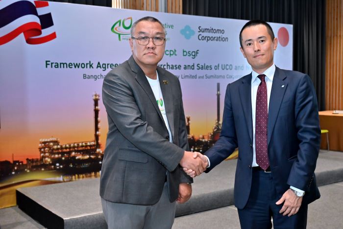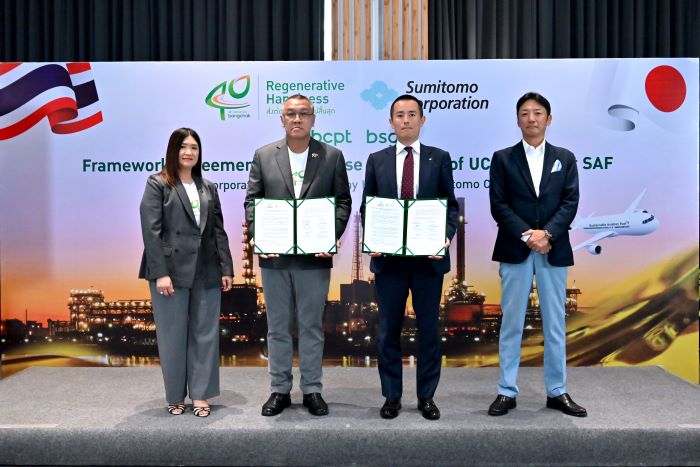 นายธรรมรัตน์ ประยูรสุข รองกรรมการผู้จัดการใหญ่ กลุ่มธุรกิจโรงกลั่นและการค้าน้ำมัน บริษัท บางจาก คอร์ปอเรชั่น จำกัด (มหาชน) ร่วมลงนามกับ Mr. Yutaka Takamura, General Manager of Green Chemical, Strategic Business Unit (SBU), Chemical Solution Group ซูมิโตโม คอร์ปอเรชั่น โดยมี Mr. Takashi Tanaka, General Manager of the Asia & Oceania Chemical Solutions Business Unit at Sumitomo Corporation Asia and Oceania Pte. Ltd. และ นางองค์อร เปลี่ยนรังษี กรรมการผู้จัดการ บริษัท บีซีพีที จำกัด ร่วมลงนามเป็นพยาน นับเป็นการเริ่มต้นความร่วมมือเชิงกลยุทธ์ระหว่างสองบริษัทเพื่อสร้างห่วงโซ่อุปทานการนำน้ำมันปรุงอาหารใช้แล้วมาสู่การผลิตและจำหน่ายน้ำมันเชื้อเพลิงอากาศยานยั่งยืน (UCO-to-SAF) ที่แข็งแกร่งและมีประสิทธิภาพ