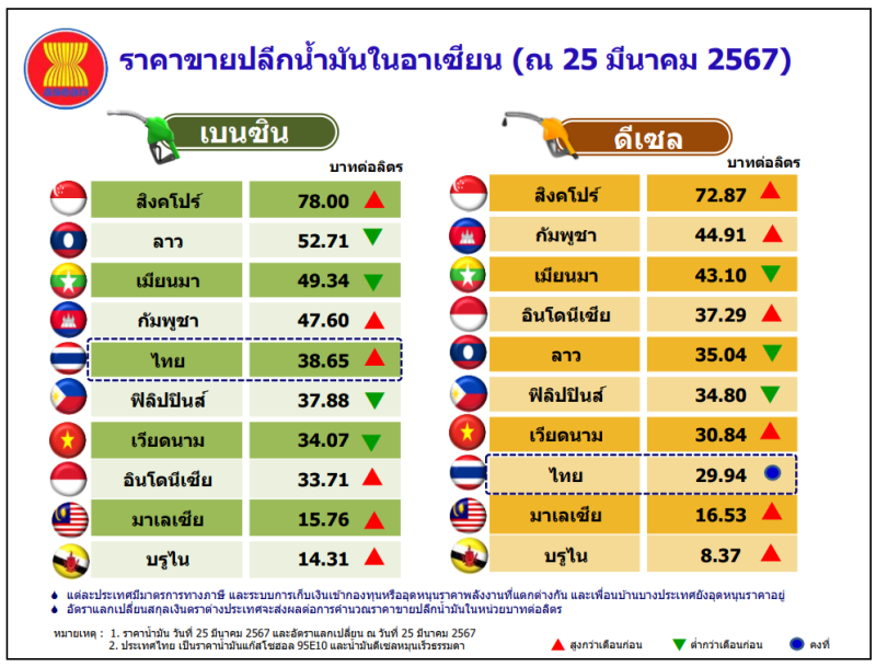นายวีรพัฒน์ กล่าวว่า สำหรับราคาขายปลีกน้ำมันเบนซินและดีเซลของประเทศไทยและต่างประเทศ ณ วันที่ 25 มีนาคม 2567 พบว่า ราคาขายปลีกน้ำมันเบนซิน ประเทศสิงคโปร์มีระดับสูงสุดในกลุ่มอาเซียน อยู่ที่ระดับ 78 บาทต่อลิตร ขณะที่ประเทศไทยอยู่ในอันดับ 5 ของกลุ่มอาเซียน อยู่ที่ระดับ 38.65 บาทต่อลิตร ส่วนราคาขายปลีกน้ำมันดีเซลนั้น ประเทศสิงคโปร์ มีระดับสูงสุดในกลุ่มอาเซียน อยู่ที่ระดับ 72.87 บาทต่อลิตร ขณะที่ประเทศไทยอยู่ในอันดับ 8 ของกลุ่มอาเซียน อยู่ที่ระดับ 29.94 บาทต่อลิตร อย่างไรก็ตาม ราคาขายปลีกน้ำมันสำเร็จรูปในแต่ละประเทศจะแตกต่างกัน ขึ้นอยู่กับโครงสร้าง มาตรการด้านภาษี และนโยบายการชดเชยราคาน้ำมันของประเทศนั้น อย่างไรก็ตาม สนพ. จะติดตามสถานการณ์ดังกล่าวอย่างต่อเนื่อง เพื่อเตรียมความพร้อมรองรับสถานการณ์ฉุกเฉินด้านพลังงานที่อาจจะเกิดขึ้น เพื่อสามารถดำเนินการบรรเทาผลกระทบด้านราคาพลังงานต่อประชาชนในระยะต่อไป