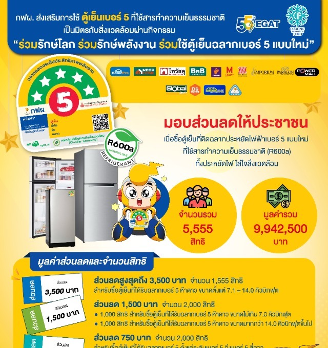 นอกจากนี้ กฟผ. มุ่งเดินหน้าส่งเสริมการใช้พลังงานภาคประชาชนให้เกิดประสิทธิภาพสูงสุดและลดคาร์บอนอย่างเป็นรูปธรรมผ่านฉลากประหยัดไฟฟ้าเบอร์ 5 แบบ 5 ดาว พร้อมมอบสิทธิ์ส่วนลดสำหรับซื้อตู้เย็นเบอร์ 5 แบบ 5 ดาว จำนวน 5,555 สิทธิ์ ตั้งแต่วันที่ 1 พ.ค. – 30 ก.ย. 67 ณ ห้างสรรพสินค้าโฮมโปร เมกาโฮม ไทวัสดุ บีเอ็นบีโฮม เพาเวอร์บาย เดอะมอลล์ เอ็มโพเรียม สยามพารากอน โกลบอลเฮ้าส์ ดูโฮม ฮาร์ดแวร์เฮาส์ และร้านสหกรณ์ กฟผ. พร้อมชวนคนไทยร่วมดาวน์โหลด LINE Sticker ชุดใหม่ "Mission Possible by ENGY" ปฏิบัติการ (ไม่) ลับกับ ENGY ครบรอบ 55 ปี กฟผ. ส่งต่อความสุขที่ยั่งยืน เพียงคลิก https://line.me/S/sticker/31088 หรือเพิ่มเพื่อนกับ กฟผ. ทาง LINE Official ที่ @egat ตั้งแต่วันที่ 1 พ.ค. - 29 ก.ค. 67