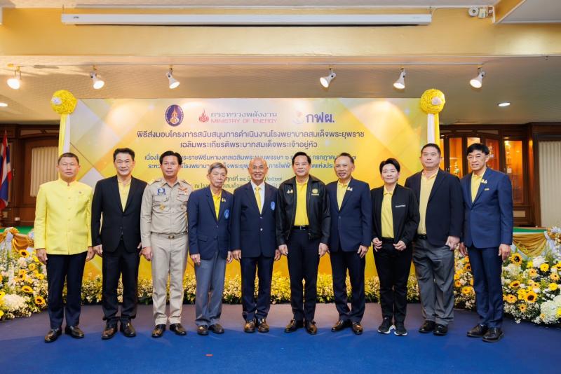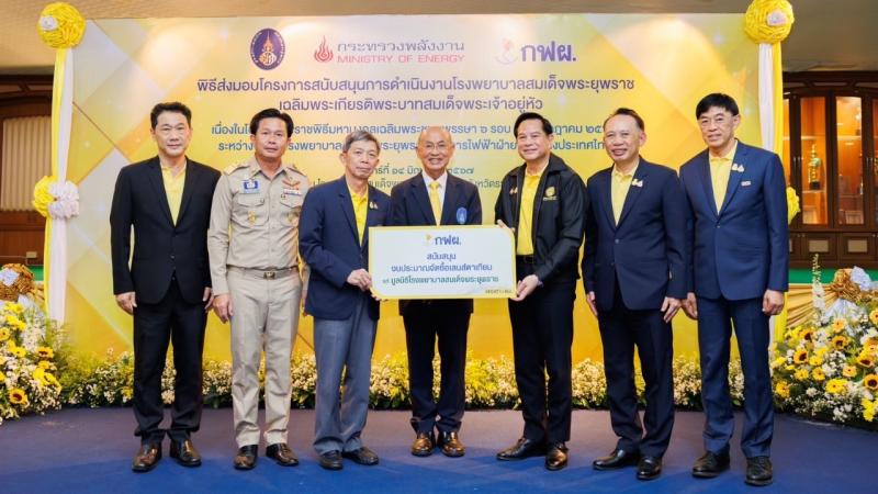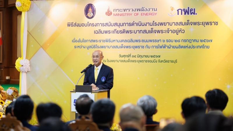 กระทรวงพลังงาน จังหวัดราชบุรี มูลนิธิโรงพยาบาลสมเด็จพระยุพราช และการไฟฟ้าฝ่ายผลิตแห่งประเทศไทย (กฟผ.) ร่วมส่งมอบโครงการสนับสนุนการดำเนินงานโรงพยาบาลสมเด็จพระยุพราช เฉลิมพระเกียรติพระบาทสมเด็จพระเจ้าอยู่หัว เนื่องในโอกาสพระราชพิธีมหามงคลเฉลิมพระชนมพรรษา 6 รอบ 28 กรกฎาคม 2567 ภายใต้การดำเนินงานของกระทรวงพลังงานและ กฟผ. ณ โรงพยาบาลสมเด็จพระยุพราชจอมบึง จังหวัดราชบุรี โดยมีศาสตราจารย์เกียรติคุณ นายแพทย์เกษม วัฒนชัย องคมนตรี เป็นประธาน พร้อมด้วยนายพีระพันธุ์ สาลีรัฐวิภาค รองนายกรัฐมนตรีและรัฐมนตรีว่าการกระทรวงพลังงาน ดร.ประเสริฐ สินสุขประเสริฐ ปลัดกระทรวงพลังงาน นายเกียรติศักดิ์ ตรงศิริ ผู้ว่าราชการจังหวัดราชบุรี นายเทพรัตน์ เทพพิทักษ์ ผู้ว่าการ กฟผ. พร้อมด้วยคณะผู้บริหารกระทรวงพลังงาน กระทรวงสาธารณสุข จังหวัดราชบุรี กฟผ. ผู้ปฏิบัติงาน และประชาชนเข้าร่วมงาน