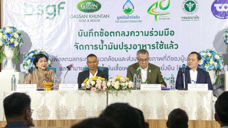 นายธรรมรัตน์ ประยูรสุข รองกรรมการผู้จัดการใหญ่ กลุ่มธุรกิจโรงกลั่นและการค้าน้ำมัน บริษัท บางจาก คอร์ปอเรชั่น จำกัด (มหาชน) และประธานกรรมการบริษัท บีเอสจีเอฟ จำกัด พร้อมด้วย นายประวิทย์ เริงโพธิ์ ประธานกรรมการบริหาร นางสาวพรหมพร เอี่ยมจิตเมตตา กรรมการผู้จัดการ บริษัท กัซซัน ขุนตาน กอล์ฟ แอนด์ รีสอร์ท จำกัด และนายธนวัฒน์ ลินจงสุบงกช ประธานกรรมการกลุ่มบริษัทธนโชคฯ ร่วมลงนามในบันทึกข้อตกลงความร่วมมือ “การรณรงค์ไม่ใช้น้ำมันทอดซ้ำและนำมาผลิตเป็นน้ำมันเชื้อเพลิงอากาศยานยั่งยืน (SAF) เพื่อลดผลกระทบด้านสิ่งแวดล้อมและส่งเสริมสุขภาพที่ดีต่อผู้บริโภค” ระหว่างบริษัท บีเอสจีเอฟฯ กลุ่มบริษัทธนโชคฯ และ กลุ่มสนามกอล์ฟกัซซันฯ โดยมีนายนิรัตน์ พงษ์สิทธิถาวร ผู้ว่าราชการจังหวัดเชียงใหม่ นายสันติธร ยิ้มละมัย ผู้ว่าราชการจังหวัดลำพูน นายรัฐพล นราดิศร ผู้ว่าราชการจังหวัดพะเยา และนายชัชวาลย์ฉายะบุตร ผู้ว่าราชการจังหวัดลำปาง พร้อมด้วยรองผู้ว่าราชการ และผู้แทนกรมอนามัย ผู้อำนวยการโรงพยาบาลลำพูน ร่วมเป็นสักขีพยาน ณ สนามกอล์ฟกัซซัน ขุนตาน กอล์ฟ แอนด์ รีสอร์ท จังหวัดลำพูน