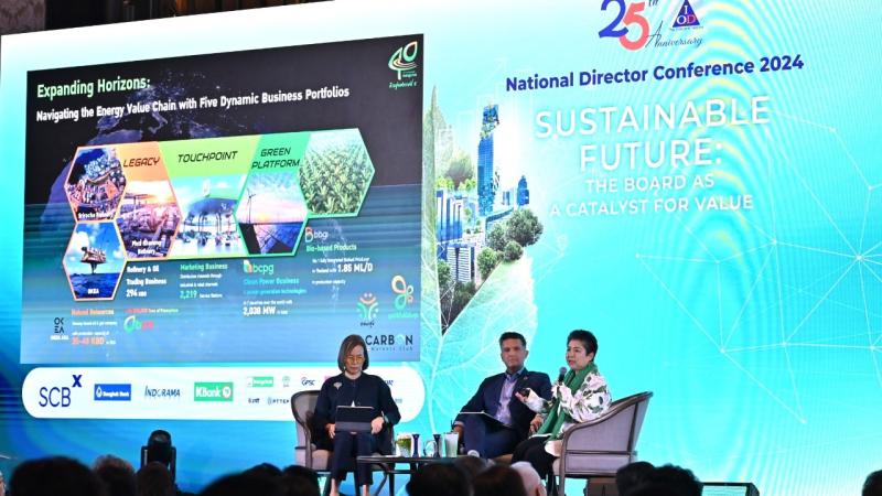 นางกลอยตา ณ ถลาง รองกรรมการผู้จัดการใหญ่ งานบริหารความยั่งยืนและสื่อสารองค์กร บริษัท บางจาก คอร์ปอเรชั่น จำกัด (มหาชน) รับเชิญร่วมเสวนาเรื่อง Business for Good: Spotlight on Sustainable Business Models แบ่งปันเส้นทางการสร้างความยั่งยืนในการดำเนินธุรกิจของบางจากฯ ในงาน National Director Conference 2024 หัวข้อ Sustainable Future: The Board as a Catalyst for Value จัดโดยสมาคมส่งเสริมสถาบันกรรมการบริษัทไทย โดยมี นายแอนโทนี วาตานาเบ ประธานเจ้าหน้าที่บริหารด้านความยั่งยืน บริษัท อินโดรามา เวนเจอร์ส จำกัด (มหาชน) เป็นผู้ร่วมเสวนา และนางสาวปิยพร พรรณเชษฐ์ ประธานเจ้าหน้าที่บริหาร บริษัท ทีซีเอ็ม คอร์ปอเรชั่น จำกัด (มหาชน) เป็นผู้ดำเนินการเสวนา โดยมีกรรมการ ผู้บริหารจากสมาคมส่งเสริมสถาบันกรรมการบริษัทไทย (Thai IOD) ร่วมรับฟังกว่า 200 คน ณ โรงแรม วอลดอล์ฟ แอสโทเรีย