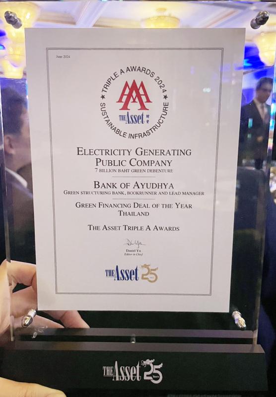 บริษัท ผลิตไฟฟ้า จำกัด (มหาชน) หรือ EGCO Group โดย ดร.จิราพร ศิริคำ กรรมการผู้จัดการใหญ่ นำคณะผู้บริหารบริษัท รับรางวัล “Green Financing Deal of The Year” จากความสำเร็จในการออกหุ้นกู้เพื่ออนุรักษ์สิ่งแวดล้อม (Green Bond) ครั้งแรก มูลค่า 7,000 ล้านบาท เมื่อเดือนพฤศจิกายน 2566 ซึ่งเป็นก้าวสำคัญที่ตอกย้ำความมุ่งมั่นของบริษัทในการผลักดันเป้าหมายด้านความยั่งยืน ในงานประกาศรางวัล The Asset Triple A Sustainable Infrastructure Awards 2024 ซึ่งจัดโดย The Asset Magazine นิตยสารด้านการเงินชั้นนำของเอเชีย เพื่อยกย่ององค์กรและธุรกรรมที่มีส่วนในการพัฒนาโครงสร้างพื้นฐานอย่างโดดเด่นในภูมิภาคเอเชีย ณ ประเทศสิงคโปร์ เมื่อวันที่ 9 กรกฎาคม 2567