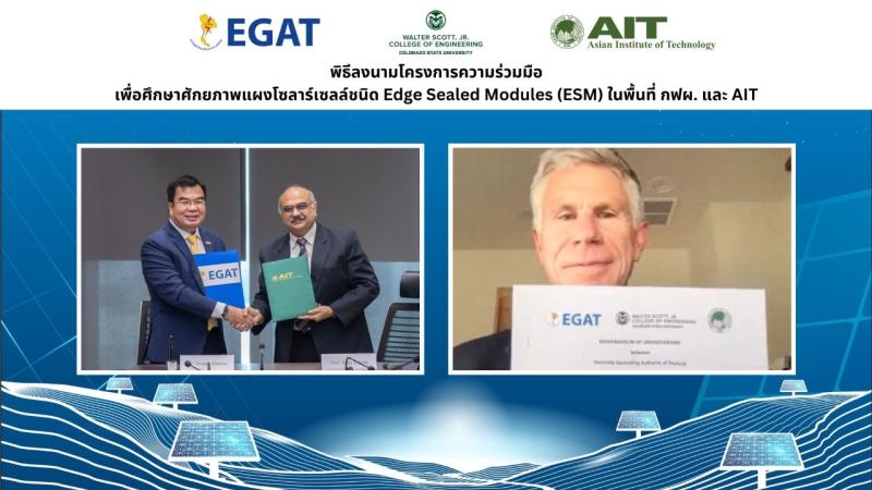 วันนี้ (15 กรกฎาคม 2567) นายทิเดช เอี่ยมสาย รองผู้ว่าการพัฒนาโรงไฟฟ้าและพลังงานหมุนเวียน การไฟฟ้าฝ่ายผลิตแห่งประเทศไทย (กฟผ.) พร้อมด้วยศาสตราจารย์นิติน ตรีปาธี (Prof. Nitin Tripathi) รักษาการรองอธิการบดีฝ่ายวิชาการ สถาบันเทคโนโลยีแห่งเอเชีย (AIT) และศาสตราจารย์เคนเน็ธ เรียร์ดอน (Prof. Kenneth F. Reardon) รองคณบดีฝ่ายวิจัย วิทยาลัยวิศวกรรมศาสตร์วอลเตอร์สก็อตต์จูเนียร์ มหาวิทยาลัยแห่งรัฐโคโลราโด (CSU) ร่วมลงนามบันทึกข้อตกลงความร่วมมือ (MOU) ผ่านระบบออนไลน์ เพื่อศึกษาศักยภาพแผงโซลาร์เซลล์ชนิด Edge Sealed Modules (ESM) ในพื้นที่ กฟผ. และ AIT
