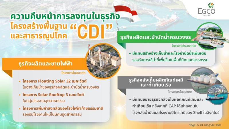 บริษัท ผลิตไฟฟ้า จำกัด (มหาชน) หรือ EGCO Group อัปเดตความคืบหน้าโครงการใหม่ ในธุรกิจโครงสร้างพื้นฐานและสาธารณูปโภค ผ่าน บริษัท พีที จันทรา ดายา อินเวสตาสิ (Chandra Daya Investasi - CDI) ในอินโดนีเซีย ภายหลังจากการเข้าไปลงทุนเมื่อปลายปี 2566 โดย CDI มีแผนพัฒนาโครงการในกลุ่มธุรกิจต่าง ๆ เพื่อรองรับความต้องการไฟฟ้าที่เพิ่มขึ้นและสนับสนุนพันธกิจในการพัฒนาพลังงานสีเขียวของอินโดนีเซีย ได้แก่ โครงการโซลาร์เซลล์บนทุ่นลอยน้ำ (Floating Solar) และโครงการโซลาร์เซลล์บนหลังคา (Solar Rooftop) กำลังผลิตรวม 35 เมกะวัตต์ การศึกษาโครงการเพิ่มกำลังผลิตของโรงไฟฟ้าก๊าซธรรมชาติ พร้อมทั้งมีแผนขยายธุรกิจผลิตและบำบัดน้ำครบวงจร รวมถึงธุรกิจคลังเก็บผลิตภัณฑ์เคมีและท่าเทียบเรือ เพื่อตอบสนองความต้องการของกลุ่มลูกค้าอุตสาหกรรมในนิคมอุตสาหกรรม และการเติบโตของพันธมิตร