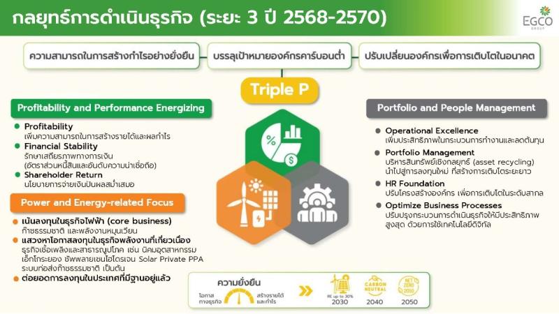 บริษัท ผลิตไฟฟ้า จำกัด (มหาชน) หรือ EGCO Group ประกาศขับเคลื่อนองค์กรภายใต้กลยุทธ์ “Triple P” ระยะ 3 ปี (ปี 2568-2570) มุ่งเพิ่มความสามารถในการสร้างรายได้และกำไร เน้นลงทุนในธุรกิจไฟฟ้า ซึ่งเป็นธุรกิจหลัก และแสวงหาโอกาสลงทุนในธุรกิจพลังงานที่เกี่ยวเนื่อง ด้วยงบลงทุนปีละ 30,000 ล้านบาท พร้อมรุกบริหารจัดการพอร์ตการลงทุนให้เกิดประสิทธิภาพสูงสุด ผ่านการพัฒนากระบวนการทำงานและทรัพยากรบุคคลรองรับการเติบโตระดับสากล ทั้งนี้ กลยุทธ์ “Triple P” มุ่งตอบโจทย์การเติบโตอย่างยั่งยืนในทุกมิติ โดยสร้างความสมดุลระหว่างโอกาสทางธุรกิจ ผลการดำเนินงานที่แข็งแรงอย่างต่อเนื่อง และการเป็นองค์กรคาร์บอนต่ำของ EGCO Group
