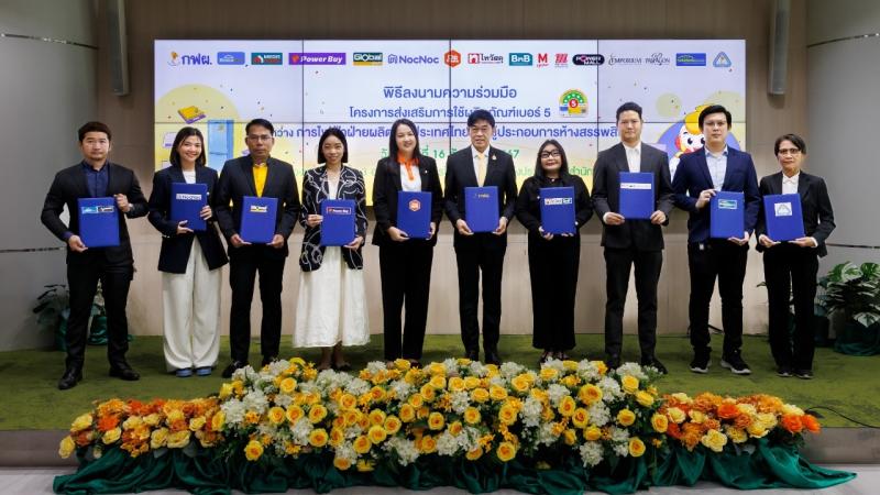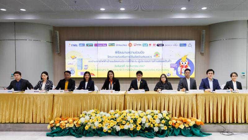 วันที่ 16 ธันวาคม 2567 - นายเทพรัตน์ เทพพิทักษ์ ผู้ว่าการการไฟฟ้าฝ่ายผลิตแห่งประเทศไทย (กฟผ.) เป็นประธานการแถลงข่าวเปิดตัวกิจกรรม กฟผ. ส่งความสุขปีใหม่ คนไทยใส่ใจรักษ์โลกพร้อมลงนามความร่วมมือโครงการส่งเสริมการใช้ผลิตภัณฑ์เบอร์ 5 ระหว่าง กฟผ. กับ ผู้ประกอบการห้างสรรพสินค้า จำนวน 9 ราย ณ ห้อง Press Conference อาคาร 50 ปี กฟผ. สำนักงานใหญ่ จ.นนทบุรี
