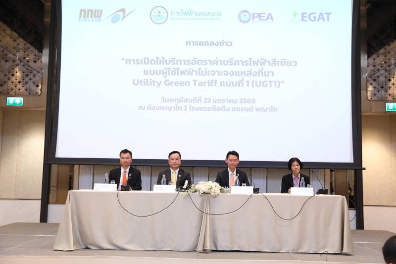 ดร.พูลพัฒน์ ลีสมบัติไพบูลย์ เลขาธิการสำนักงานคณะกรรมการกำกับกิจการพลังงาน (สำนักงาน กกพ.) ในฐานะโฆษก กกพ. เปิดเผยว่า ทางการไฟฟ้าทั้ง 3 การ ซึ่งได้แก่ กฟผ. กฟน. และ กฟภ. พร้อมแล้วที่จะเปิดให้บริการอัตราค่าบริการไฟฟ้าสีเขียวแบบผู้ใช้ไฟฟ้าไม่เจาะจงแหล่งที่มา (UGT1) โดยเป็นการเพิ่มทางเลือกให้กับผู้ประกอบการธุรกิจภาคเอกชน ที่มีความจำเป็น หรือมีความต้องการใช้ไฟฟ้าสีเขียวสำหรับการดำเนินธุรกิจ โดยได้กำหนดอัตรา UGT1 เป็นส่วนเพิ่มจากค่าไฟฟ้าตามปกติหน่วยละประมาณ 6 สตางค์ต่อหน่วย โดยผู้ประกอบการที่สนใจสามารถติดต่อขอรับบริการได้ โดยผู้ใช้ไฟฟ้าในพื้นที่ กฟภ. ผ่านแพลตฟอร์ม ugt.pea.co.th ผู้ใช้ไฟฟ้าในพื้นที่ กฟน. ที่เว็บไซต์ mea.or.th ลูกค้าตรง กฟผ. ที่เว็บไซต์ egat.co.th ถึงวันที่ 28 ก.พ. 68 ทั้งนี้ ค่าส่วนเพิ่มดังกล่าวจะเรียกเก็บเฉพาะผู้ที่ใช้ไฟฟ้า UGT1 เท่านั้น จึงไม่ส่งผลกระทบต่อผู้ใช้ไฟฟ้าทั่วไป