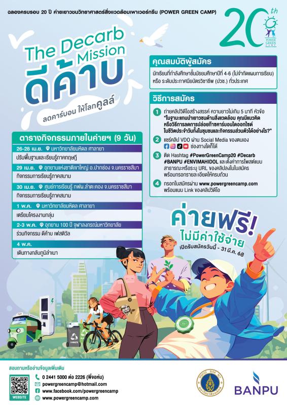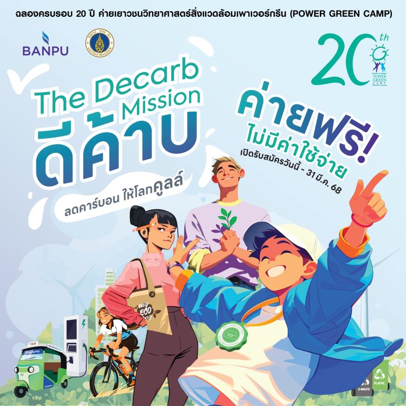 บริษัท บ้านปู จำกัด (มหาชน) ร่วมกับ คณะสิ่งแวดล้อมและทรัพยากรศาสตร์ มหาวิทยาลัยมหิดล อยากชวนนักเรียนชั้นมัธยมศึกษาปีที่ 4-6 ทั่วประเทศ (ไม่จำกัดแผนการเรียน) หรือระดับประกาศนียบัตรวิชาชีพ (ปวช.) ที่มีแพสชันในการอนุรักษ์สิ่งแวดล้อม และต้องการแสดงศักยภาพของคนรุ่นใหม่เพื่อร่วมสร้างสรรค์โลกให้คูลล์กว่าเดิม มาสมัครเข้าร่วม ค่ายเยาวชนวิทยาศาสตร์สิ่งแวดล้อม (Power Green Camp) ครั้งที่ 20 ซึ่งปีนี้จัดขึ้นภายใต้แนวคิด “ดีค้าบ – The Decarb Mission” ลดคาร์บอน ให้โลกคูลล์ เพื่อสร้างความรู้และความเข้าใจเกี่ยวกับการลดการปล่อยก๊าซคาร์บอนไดออกไซด์ (Decarbonization) และการนำเอาวิทยาศาสตร์และเทคโนโลยีไปช่วยแก้ไขปัญหาสิ่งแวดล้อมอย่างยั่งยืน