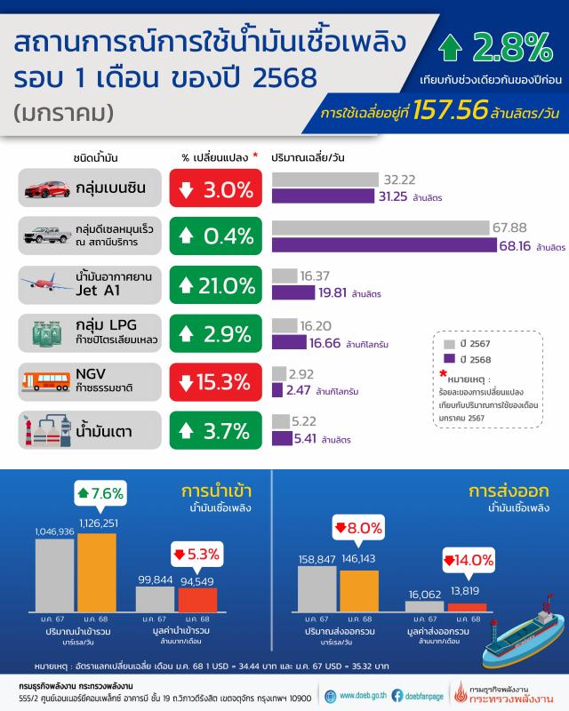 นายสราวุธ แก้วตาทิพย์ อธิบดีกรมธุรกิจพลังงาน เผยภาพรวมการใช้น้ำมันเชื้อเพลิง เดือนมกราคม 2568 อยู่ที่ 157.56 ล้านลิตร/วัน เพิ่มขึ้นร้อยละ 2.8 เมื่อเทียบกับช่วงเดียวกันของปีก่อน จากการฟื้นตัวของภาคท่องเที่ยวและบริการ รวมทั้งมาตรการกระตุ้นเศรษฐกิจโดยที่น้ำมันดีเซลหมุนเร็ว ณ สถานีบริการเพิ่มขึ้นร้อยละ 0.4 น้ำมันอากาศยานเชิงพาณิชย์ (Jet A1) เพิ่มขึ้นร้อยละ 21 และการใช้ LPGเพิ่มขึ้นร้อยละ 2.9 ขณะที่กลุ่มเบนซินลดลงร้อยละ 3.0 การใช้น้ำมันเตาเพิ่มขึ้นร้อยละ 3.7 และ NGV ลดลงร้อยละ 15.3