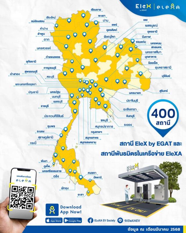 นอกจากนั้นแล้ว กฟผ. ได้เร่งขยายการให้บริการสถานีชาร์จ EleX by EGAT และสถานีพันธมิตรในเครือข่าย EleXA แล้ว 413 แห่งทั่วประเทศ โดยในปี 2568 ตั้งเป้าขยายสถานีให้ได้รวม 520 แห่ง
