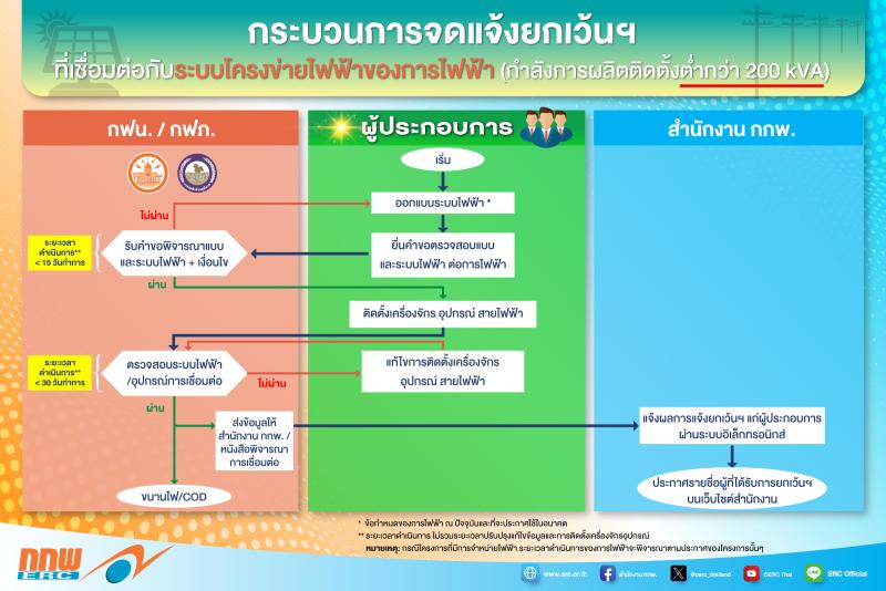 ผู้ประกอบกิจการพลังงานสามารถยื่นคำขอตรวจสอบแบบและระบบไฟฟ้า เพื่อเชื่อมต่อเข้ากับโครงข่ายไฟฟ้าของการไฟฟ้าฝ่ายจำหน่าย ผ่านระบบของการไฟฟ้าฝ่ายจำหน่าย (ให้ถือว่าได้ยื่นคำขอแจ้งการประกอบกิจการพลังงานที่ได้รับการยกเว้นไม่ต้องขอรับใบอนุญาตฯ) และการไฟฟ้าฝ่ายจำหน่ายจะตรวจสอบการเชื่อมต่อระบบไฟฟ้า หากเชื่อมต่อระบบการไฟฟ้าฝ่ายจำหน่ายได้ จะส่งข้อมูลมายังสำนักงาน กกพ. เพื่อแจ้งผลการแจ้งยกเว้นผ่านระบบอิเล็กทรอนิกส์ และประกาศรายชื่อผู้ได้รับการยกเว้นบนเว็บไซต์สำนักงาน