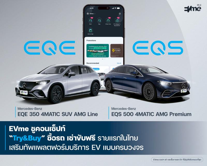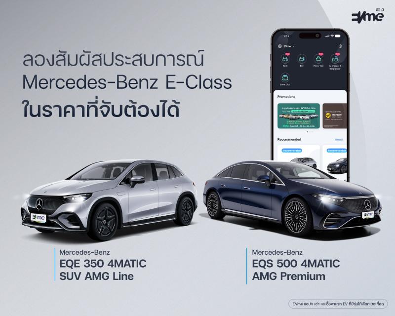 บริษัท อีวี มี พลัส จำกัด (EVme) ผู้นำด้านบริการและแพลตฟอร์มยานยนต์ไฟฟ้าแบบครบวงจร เดินหน้าขยายพอร์ตยานยนต์ไฟฟ้า (EV) อย่างต่อเนื่อง จับมือ บริษัท เบนซ์พระราม 3 จำกัด ตัวแทนจำหน่ายเมอร์เซเดส-เบนซ์ อย่างเป็นทางการของบริษัท เมอร์เซเดส-เบนซ์ (ประเทศไทย) จำกัด นำรถยนต์ไฟฟ้าแบรนด์ Mercedes-Benz รุ่น EQS 500 4MATIC AMG Premium และ EQE 350 SUV AMG Line ให้บริการเช่าผ่านแอปพลิเคชัน EVme