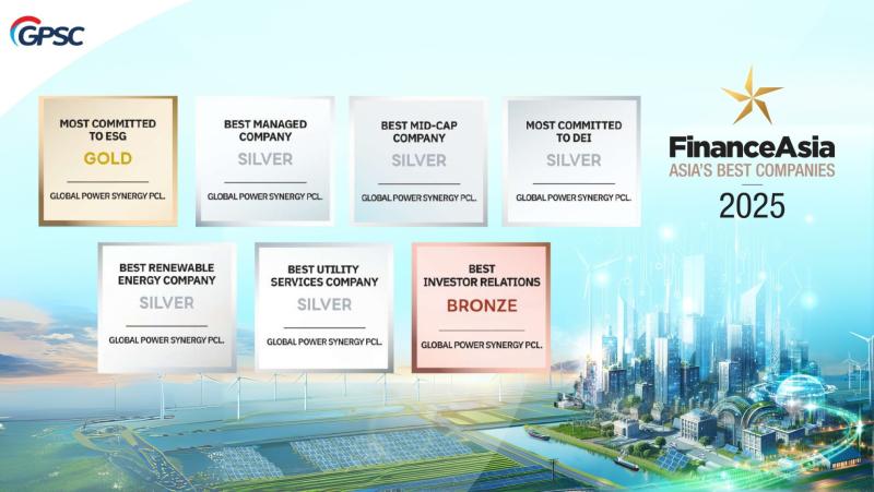 บริษัท โกลบอล เพาเวอร์ ซินเนอร์ยี่ จำกัด (มหาชน) หรือ GPSC แกนนำนวัตกรรมธุรกิจไฟฟ้ากลุ่ม ปตท. ได้รับการจัดอันดับจากนิตยสารทางการเงินที่มีชื่อเสียงชั้นนำของเอเชีย Finance Asia Awards 2025 จากการสำรวจความคิดเห็นของผู้จัดการกองทุน นักวิเคราะห์ และนักการเงินในภูมิภาค โดยในปีนี้ GPSC ได้รับถึง 7 รางวัล ประกอบด้วย ระดับ Gold จำนวน 1 รางวัล ได้แก่ Most Committed to ESG (บริษัทที่มีความมุ่งมั่นในการดำเนินธุรกิจภายใต้หลัก ESG ยอดเยี่ยม) ระดับ Silver จำนวน 5 รางวัล ได้แก่ Best Utility Services Company (บริษัทที่ให้บริการสาธารณูปโภคยอดเยี่ยม), Best Renewable Energy Company (บริษัทด้านพลังงานหมุนเวียนยอดเยี่ยม), Best Managed Company (บริษัทที่บริหารจัดการยอดเยี่ยม), Best Mid-Cap Company (บริษัทขนาดกลางที่มีผลงานดีเด่น), Most Committed to DEI (บริษัทที่มุ่งมั่นต่อความหลากหลาย ความเท่าเทียม และการมีส่วนร่วม) และระดับ Bronze จำนวน 1 รางวัล ได้แก่ Best Investor Relations (นักลงทุนสัมพันธ์ยอดเยี่ยม)