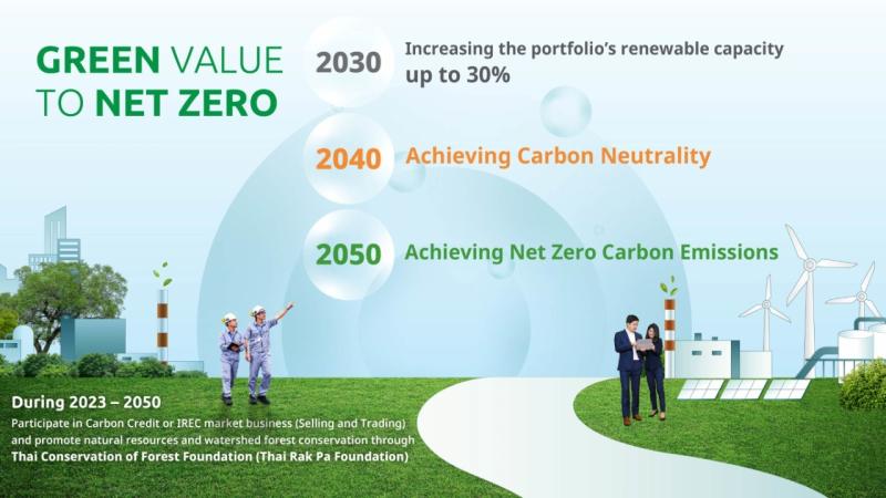 นายวิชาญ ศรีไพโรจน์ ผู้ช่วยกรรมการผู้จัดการใหญ่สายบริหารโรงไฟฟ้า EGCO Group เปิดเผยว่า EGCO Group มุ่งดำเนินธุรกิจไฟฟ้าและธุรกิจพลังงานที่เกี่ยวเนื่องตามกรอบ ESG มาตลอดระยะเวลา 33 ปี EGCO Group ตั้งเป้าหมายเพื่อมุ่งสู่การเป็นองค์กรคาร์บอนต่ำ 3 ระยะ ได้แก่ เป้าหมายระยะสั้น เพิ่มสัดส่วนการผลิตไฟฟ้าจากพลังงานหมุนเวียนเป็น 30% ของกำลังผลิตทั้งหมด ภายในปี 2030 เป้าหมายระยะกลาง บรรลุความเป็นกลางทางคาร์บอน (Carbon Neutrality) ภายในปี 2040 และเป้าหมายระยะยาว บรรลุการปลดปล่อยก๊าซเรือนกระจกสุทธิเป็นศูนย์ (Net Zero Carbon) ภายในปี 2050 เพื่อร่วมบรรเทาปัญหาการเปลี่ยนแปลงสภาพภูมิอากาศโลกและตอบสนองการเปลี่ยนผ่านของอุตสาหกรรมพลังงานไปสู่พลังงานสะอาด (Energy Transition)