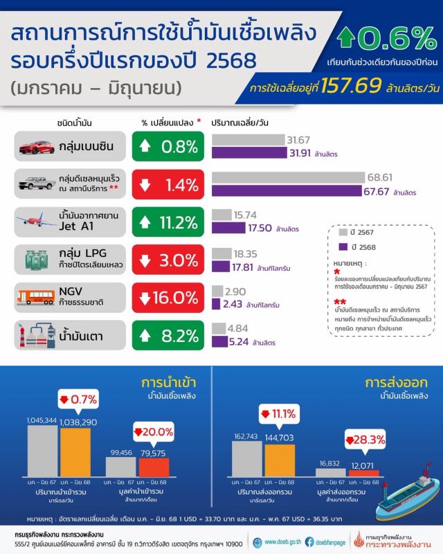 นายสราวุธ แก้วตาทิพย์ อธิบดีกรมธุรกิจพลังงาน เผยภาพรวมการใช้น้ำมันเชื้อเพลิง เดือนมกราคม - มิถุนายน 2568 อยู่ที่ 157.69 ล้านลิตร/วัน เพิ่มขึ้นร้อยละ 0.6 เมื่อเทียบกับช่วงเดียวกันของปีก่อน โดยที่น้ำมันอากาศยานเชิงพาณิชย์ (Jet A1) เพิ่มขึ้นร้อยละ 11.2 และการใช้น้ำมันเตาเพิ่มขึ้นร้อยละ 8.2 ขณะที่กลุ่มเบนซินเพิ่มขึ้นร้อยละ 0.8 ขณะที่การใช้ LPG ลดลงร้อยละ 3.0 น้ำมันดีเซลหมุนเร็ว ณ สถานีบริการลดลงร้อยละ 1.4 และ NGV ลดลงร้อยละ 16.0