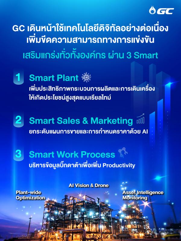 GC ได้เดินหน้าทรานส์ฟอร์มองค์กรผ่านแนวทางการเพิ่มประสิทธิภาพแบบองค์รวม หรือ Holistic Optimization ควบคู่กับการนำนวัตกรรมและเทคโนโลยีดิจิทัลมาประยุกต์ใช้ในทุกมิติ ซึ่งครอบคลุม 3 ด้านหลัก ได้แก่