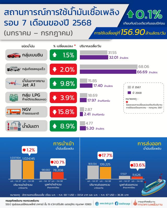 นายสราวุธ แก้วตาทิพย์ อธิบดีกรมธุรกิจพลังงาน เผยภาพรวมการใช้น้ำมันเชื้อเพลิง เดือนมกราคม - กรกฎาคม 2568 อยู่ที่ 156.90 ล้านลิตร/วัน เพิ่มขึ้นร้อยละ 0.1 เมื่อเทียบกับช่วงเดียวกันของปีก่อน โดยที่น้ำมันอากาศยานเชิงพาณิชย์ (Jet A1) เพิ่มขึ้นร้อยละ 9.8 การใช้น้ำมันเตาเพิ่มขึ้นร้อยละ 8.9 และกลุ่มเบนซินเพิ่มขึ้นร้อยละ 1.5 ขณะที่การใช้ LPG ลดลงร้อยละ 3.9 น้ำมันดีเซลหมุนเร็วลดลงร้อยละ 2.0 และ NGV ลดลงร้อยละ 15.8