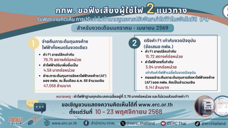 ทั้งนี้ กกพ. เปิดรับฟังความคิดเห็นผ่านทางเว็บไซต์สำนักงาน กกพ. ตั้งแต่วันที่ 10 - 23 พฤศจิกายน 2568 ก่อนที่จะมีการสรุปและประกาศอย่างเป็นทางการต่อไป