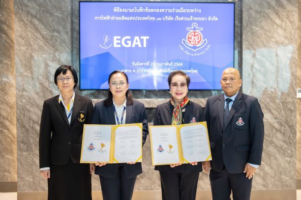วันนี้ (23 กุมภาพันธ์ 2564) ดร.จิราพร ศิริคำ รองผู้ว่าการยุทธศาสตร์ ในฐานะโฆษกการไฟฟ้าฝ่ายผลิตแห่งประเทศไทย (กฟผ.) และนางสุภาพรรณ พิชัยรณรงค์สงคราม ประธานกรรมการ บริษัท เรือด่วนเจ้าพระยา จำกัด ลงนามบันทึกข้อตกลงความร่วมมือด้านวิชาการและพัฒนานวัตกรรม เพื่อบูรณาการความร่วมมือในการทดสอบการเดินเรือโดยสารพลังงานไฟฟ้าในแม่น้ำเจ้าพระยา สู่การทำธุรกิจเดินเรือโดยสารที่เป็นมิตรต่อสิ่งแวดล้อมร่วมกัน ณ สำนักงานใหญ่ กฟผ. จ.นนทบุรี