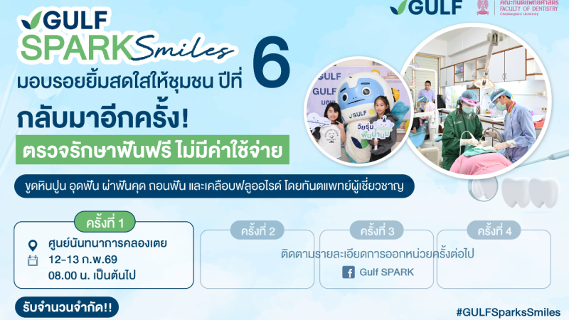 กลับมาอีกครั้งกับโครงการ “GULF Sparks Smiles มอบรอยยิ้มสดใสให้ชุมชน ปี 6” โดย บริษัท กัลฟ์ ดีเวลลอปเมนท์ จำกัด (มหาชน) หรือ GULF สานต่อเจตนารมณ์ในการยกระดับคุณภาพชีวิตแก่ชุมชน ร่วมกับ คณะทันตแพทยศาสตร์ จุฬาลงกรณ์มหาวิทยาลัย ออกหน่วยทันตกรรมเคลื่อนที่เพื่อให้บริการตรวจรักษาและดูแลสุขภาพช่องปากแก่ประชาชนโดยไม่มีค่าใช้จ่าย ในวันที่ 12-13 กุมภาพันธ์ 2569 ณ ศูนย์นันทนาการคลองเตย กทม. สำหรับผู้ที่สนใจเข้ารับบริการสามารถ walk-in มาลงทะเบียนได้ในวันที่ 12 กุมภาพันธ์ 2569 เวลา 8.00 น. – 9.00 น. เท่านั้น (รับจำนวนจำกัด)