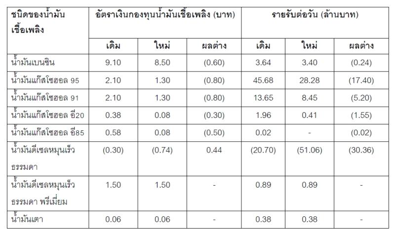 ปัจจุบัน ฐานะกองทุนนํ้ามันฯ ณ วันที่ 22 กุมภาพันธ์ 2569 กองทุนนํ้ามันฯ เป็นบวกอยู่ที่ 2,385 ล้านบาท แบ่งเป็น บัญชีนํ้ามันบวกอยู่ที่ 40,374 ล้านบาท และบัญชี LPG ติดลบอยู่ที่ 37,989 ล้านบาท ส่วนการปรับลดอัตราเงินส่งเข้ากองทุนนํ้ามันฯ ประเภทนํ้ามัน จะทำให้รายรับลดลงประมาณวันละ 54.77 ล้านบาท จากเดิ่มจากเดิมที่มีรายรับประมาณวันละ 45.52 ล้านบาท เป็นมีรายจ่ายประมาณวันละ 9.25 ล้านบาท (รายละเอียดในตาราง)