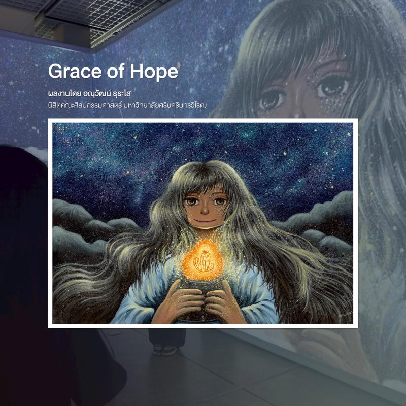 5) “Grace of Hope” ผลงาน “อณุวัฒน์ ธุระโส” นิสิตชั้นปีที่ 1 คณะศิลปกรรมศาสตร์ มหาวิทยาลัยศรีนครินทรวิโรฒ สะท้อนตัวตนของ “น้องอ๋อมแอ๋ม – น.ส.ณีรนุช สุริเตอร์” ที่มีความแข็งแกร่ง สามารถฝ่าฟันทุกสถานการณ์ที่ผ่านเข้ามาและก็ยืนหยัดที่จะอยู่ด้วยตนเองได้