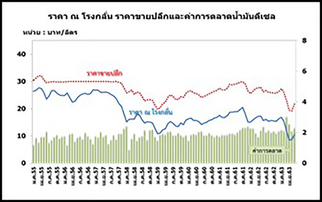 ค่าการตลาดของน้ำมันเบนซิน แก๊สโซฮอล และดีเซล เฉลี่ยอยู่ที่ 2.49 บาท/ลิตร (รวมค่าขนส่งน้ำมันทางท่อจากศรีราชา - กรุงเทพฯ 0.15 บาท/ลิตร) และค่าการกลั่น เฉลี่ยอยู่ที่ระดับ 0.39 บาท/ลิตร จากค่าเงินบาทแข็งค่าขึ้นจากสัปดาห์ที่แล้ว 0.02 บาท/เหรียญสหรัฐฯ เฉลี่ย 31.2706 บาท/เหรียญสหรัฐฯ (ต้นทุนน้ำมันเบนซินเพิ่มขึ้น 0.39 บาท/ลิตร น้ำมันดีเซลเพิ่มขึ้น 0.05 บาท/ลิตร)