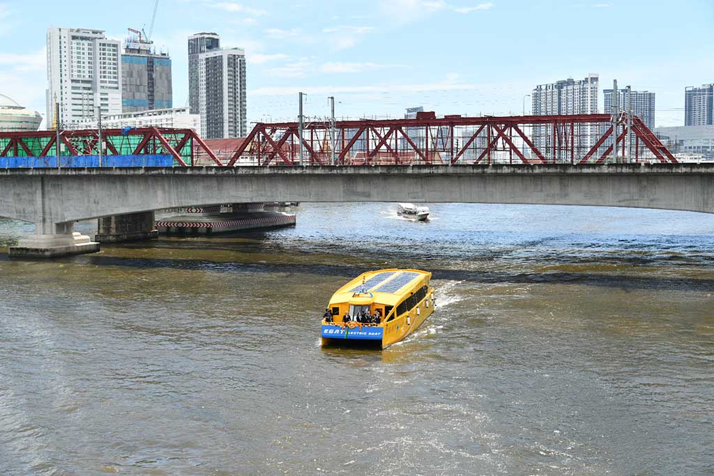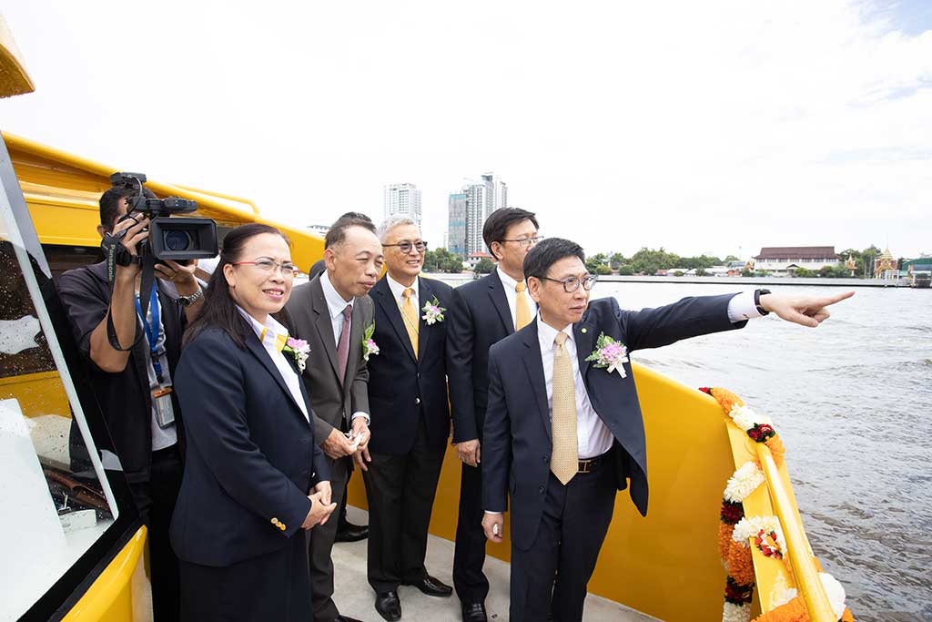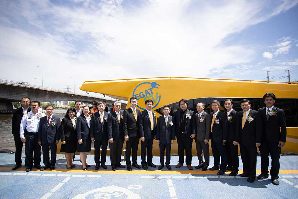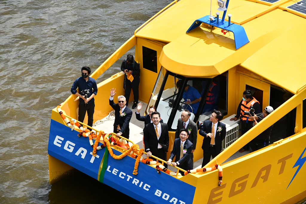 นอกจากนี้ กฟผ. ได้พัฒนาเรือโดยสารไฟฟ้า จำนวน 2 ลำ ซึ่งขับเคลื่อนด้วยพลังงานไฟฟ้าจากแบตเตอรี่ลิเทียมไอออนขนาด 214 กิโลวัตต์-ชั่วโมง สามารถแล่นด้วยความเร็วไม่น้อยกว่า 10 น็อต ระยะทางประมาณ 60 กิโลเมตรต่อการชาร์จ 1 ครั้ง โดยระบบปรับอากาศในห้องโดยสารถูกออกแบบให้ใช้พลังงานไฟฟ้าจากโซลาเซลล์ที่ติดตั้งอยู่บริเวณหลังคาเรือทั้ง 2 ลำ รองรับผู้โดยสารได้ลำละ 80 คน ซึ่งในระยะแรกจะทดสอบการเดินเรือเพื่อศึกษาวิจัยและประเมินสมรรถนะของเรือ โดยนำมาใช้ในภารกิจของ กฟผ. ก่อน แล้วจึงจะขยายผลสู่การใช้ประโยชน์สำหรับภาคประชาชนในอนาคตเพื่อเชื่อมต่อการเดินทาง “ล้อ ราง เรือ” ส่วนสถานีอัดประจุไฟฟ้าสำหรับเรือไฟฟ้าอยู่ระหว่างดำเนินการติดตั้งบริเวณฝ่ายปฏิบัติการภาคกลาง กฟผ.