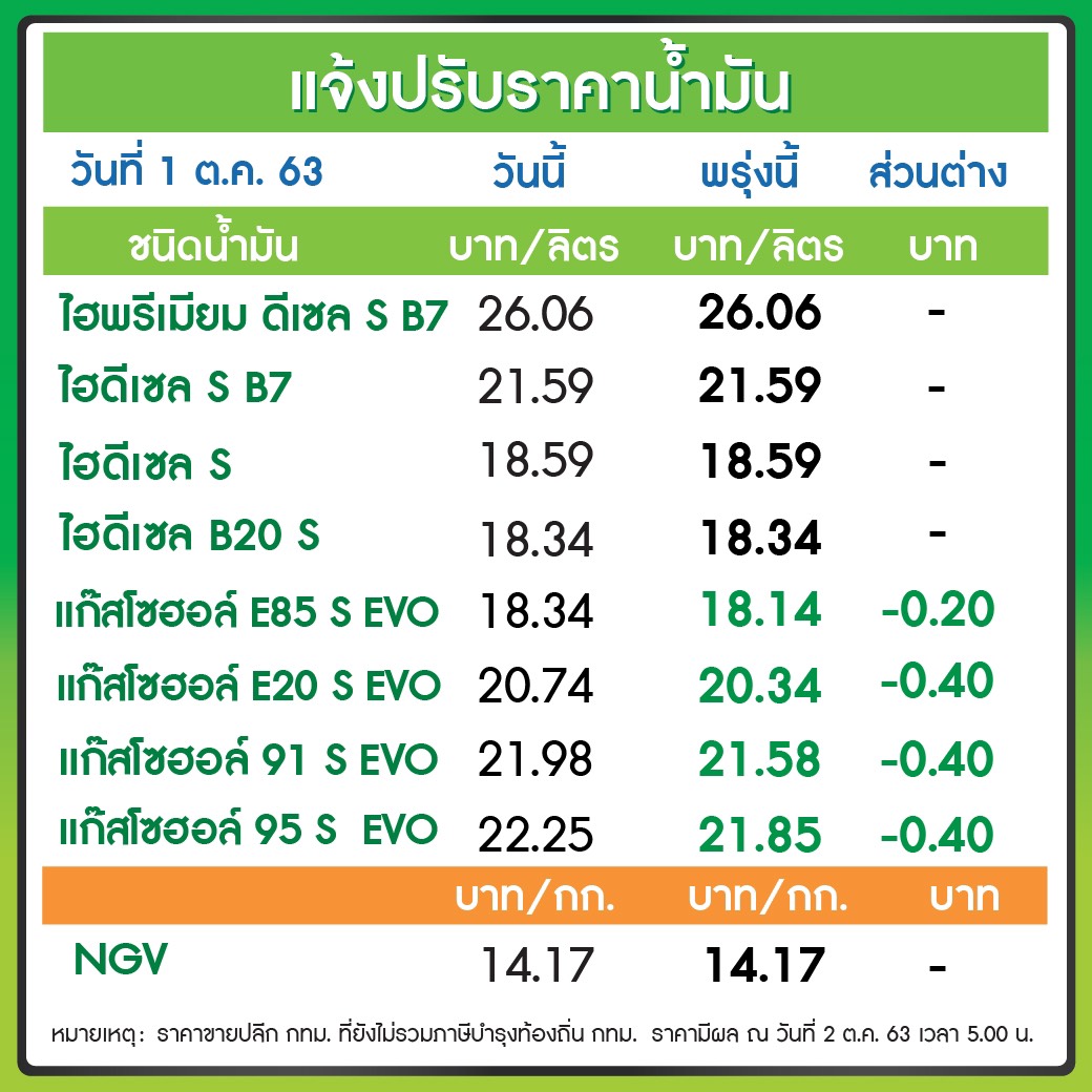 BCP Retail Price: GSH95S EVO =21.85/ GSH91S EVO =21.58/ GSH E20S EVO =20.34 / GSH E85S EVO =18.14 / Hi Diesel B20S =18.34 / Hi Diesel S B10 = 18.59/ Hi Diesel S =21.59/ Hi Premium Diesel S =26.06 (ราคาดังกล่าวยังไม่รวมภาษีบำรุงท้องที่ กทม.)